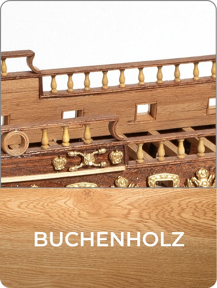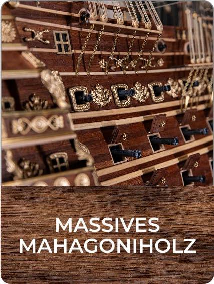 Massivmahagoni: äußere Rumpfbeplankung, Masten, Heckspiegel, Steven, Kiel, Hecksteven, Ruderklinge, Balkone, Lafetten u. v. m.
