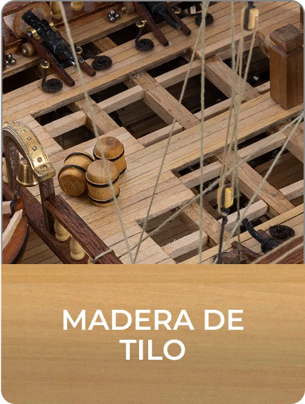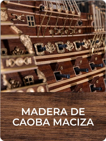 Caoba maciza: Forro exterior del casco, mástiles, espejo de popa, roda, quilla, codaste, pala de timón, balcones, cureñas y más