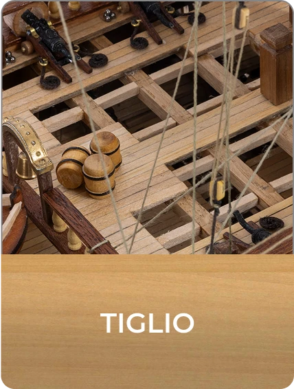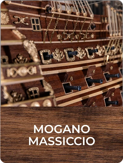 Mogano massello: fasciame esterno dello scafo, alberi, specchio di poppa, ruota di prua, chiglia, dritto di poppa, pala del timone, balconate, affusti e altro