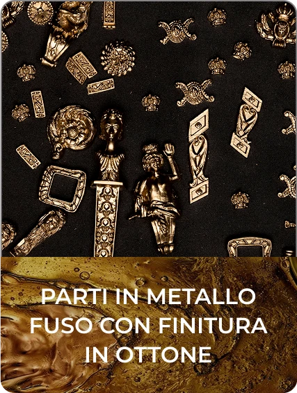 Metallo fuso e ottone: ornamenti e decorazioni in metallo fuso con finitura ottone, catene in ottone, cannoni torniti in ottone pieno, supporti della base a fiore di lis in finitura rame antico, ecc.